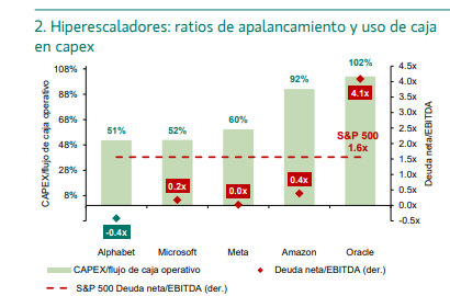 Hoy en día, la inversión agregada supone un 27% del flujo de caja mientras que, en el año 2000, llegó a alcanzar el 90%. Es fundamental tener en cuenta que las actuales inversiones se están abordando con mucha menos deuda que en el pasado. Dentro de los hiperescaladores –grandes proveedores globales de servicios y computación en la nube– hay compañías como Alphabet que, aunque están destinando a inversión la mitad de su flujo de caja, no tienen deuda neta. Otros, como Microsoft, Meta o incluso Amazon, tienen una deuda neta contenida respecto a sus beneficios que se sitúa ampliamente por debajo de las 1,6x del promedio de compañías que componen el S&P 500.