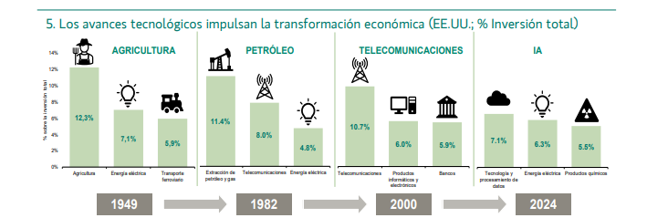 Los avances tecnológicos son una fuente de disrupción, pero también el principal motor del crecimiento económico. Así ocurrió durante la revolución industrial, la electrificación de los años 20 – llegando al 68% de los hogares estadounidenses en tan solo una década–, o el desarrollo de internet, periodos en los que la enorme inversión supuso un destacado impulso de la productividad. A pesar de las fortísimas inversiones que actualmente se están llevando a cabo, equivalentes a un 7% del PIB norteamericano, "no nos encontramos en niveles desproporcionados si tenemos en cuenta la tendencia histórica de inversión en tecnología e I+D. De hecho, la variación de la inversión como porcentaje del PIB fue mucho mayor en otros ciclos previos de progreso tecnológico, como la minería en Australia a comienzos del milenio (+5,1 puntos desde 2005 a 2012), o el petróleo en EE.UU. en los 70’ (+1,5 puntos)", señala el House View de Banca March.