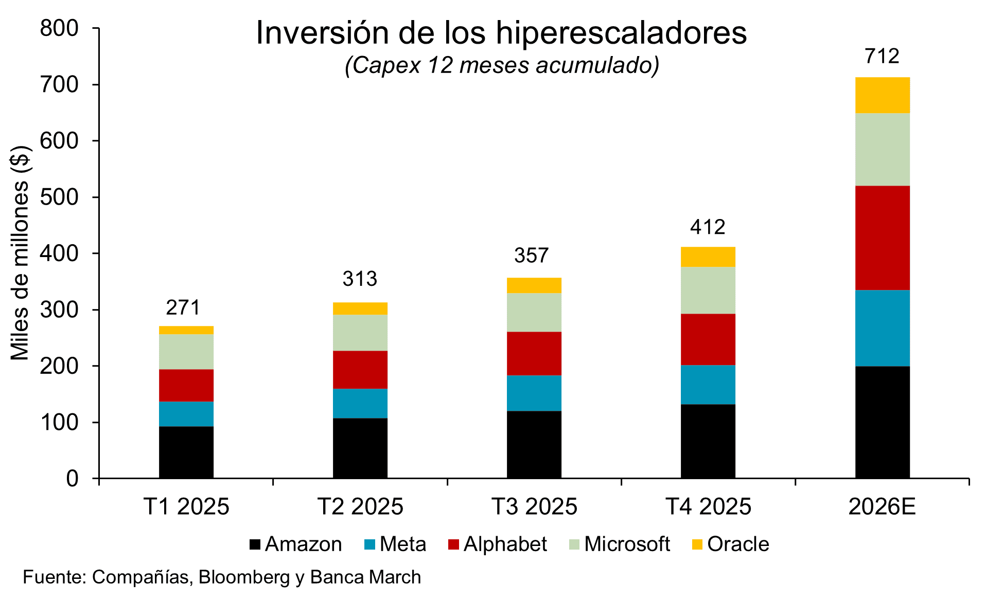 Si agregamos las inversiones previstas para este ejercicio por los cinco principales hiperescaladores —Meta, Amazon, Alphabet, Microsoft y Oracle—, la cifra asciende a 670.000 millones$, frente a los algo más de 500.000 millones estimados antes de las presentaciones de resultados. En definitiva, el volumen de inversión sigue creciendo ante una demanda de computación que no da muestras de desaceleración. Las grandes tecnológicas mantienen una estrategia alineada y un objetivo claro: no quedarse atrás en el desarrollo, despliegue y soporte de la inteligencia artificial. Sin embargo, el mercado sigue escéptico en la capacidad de rentabilizar estas inversiones y continuó castigando al sector tecnológico.
