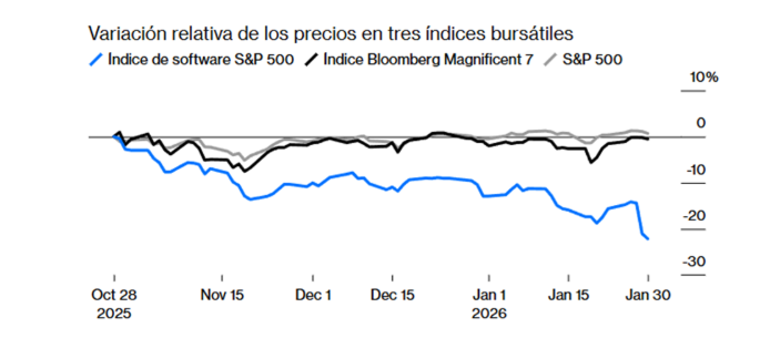 En este contexto entra en juego el factor que acelera todos los riesgos latentes: la inteligencia artificial. La carrera por la IA está reconfigurando sectores enteros. En Bolsa ya hemos visto el impacto: el sector software ha sufrido correcciones relevantes mientras el índice general se mantiene fuerte. Muchos modelos tradicionales, especialmente los vinculados a tareas administrativas o de back office, están perdiendo atractivo a gran velocidad. Las empresas intentan adaptarse incorporando IA a sus productos, pero no siempre es suficiente ni llega a tiempo.