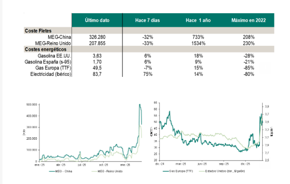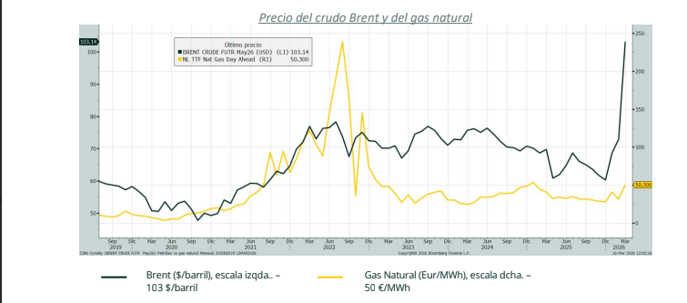 El principal daño al crecimiento y la inflación, a escala mundial, vienen de la vertiente energética, tanto en lo que respecta a la potencial escasez de crudo y gas natural (por interrupciones en el Estrecho de Ormuz) como por la subida de sus precios. El petróleo se ha ido muy por encima del nivel alcanzado en 2022, cuando Rusia invadió Urania, porque el cierre del Estrecho de Ormuz realmente compromete el abastecimiento de muchos países, algo por lo que no se llegó a temer entonces. Por el contrario, el precio del gas en Europa se mantiene mucho más contenido que hace cuatro años (pocas importaciones europeas de gas desde Oriente Medio), por la gravedad que se suponía iba a provocar la potencial interrupción de gas ruso hacia los países europeos.