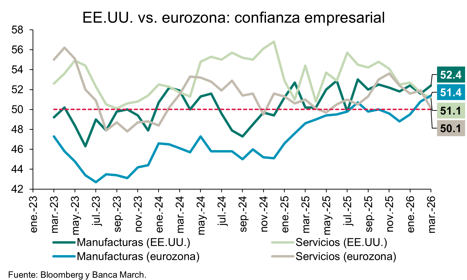En este contexto, el volátil temperamento de Trump se enfrenta a la firmeza iraní y a una contienda que empieza a incomodar seriamente a Washington. Aunque las señales son contradictorias, resulta positivo para los mercados constatar que la Administración Trump muestra una sensibilidad creciente ante las presiones y que los incentivos para un fin rápido del conflicto que no solo están del lado estadounidense: el debilitado régimen iraní también busca sobrevivir a la mayor amenaza existencial desde su fundación.