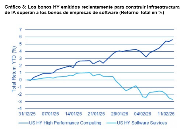 Adicionalmente, se observa un mayor escrutinio en torno al mercado de crédito privado y sus actores. Este segmento ha experimentado un crecimiento extraordinario en los últimos años al expandirse en áreas no institucionales con soluciones semilíquidas, que empiezan a mostrar ahora signos de fragilidad, especialmente en aquellas vinculadas al software. Dada su opacidad y su interconexión con la economía real, las tensiones sobre el mercado del crédito privado podrían actuar como catalizadoras de una inestabilidad financiera generalizada.