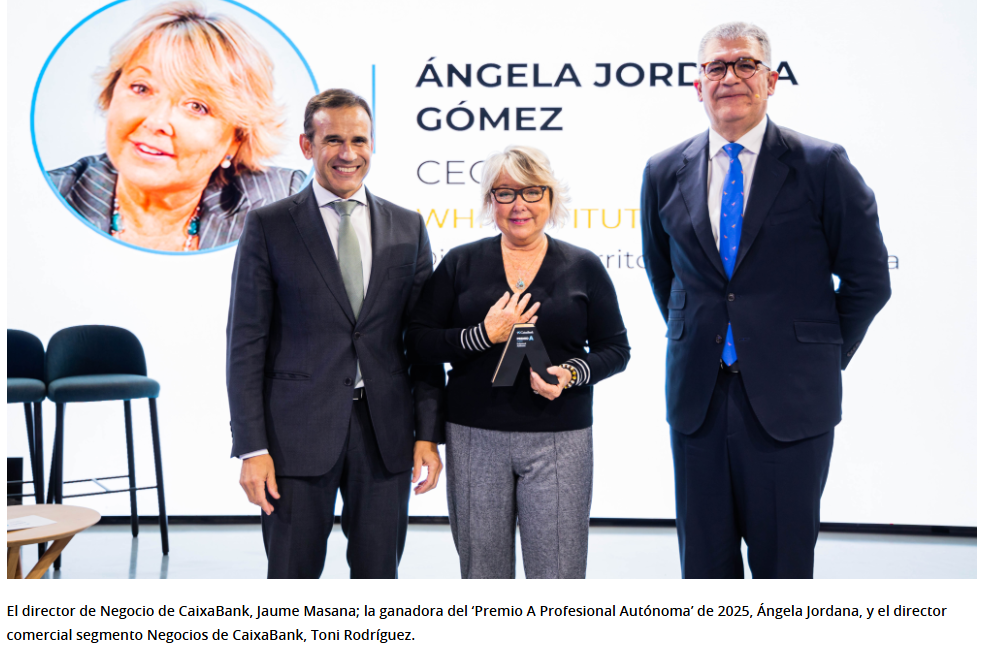 Ángela Jordana (Barcelona) ha sido seleccionada por su trayectoria profesional como la ganadora en la categoría nacional de la quinta edición del Premio A Profesional Autónoma de CaixaBank. Jordana es la CEO de WHI-Institute, un proyecto ubicado en Barcelona con impacto social pionero en el enfoque científico y aplicación práctica de la salutogénesis, comprometida con la investigación y desarrollo de soluciones innovadoras en salud mental mediante tecnología avanzada y gamificación.