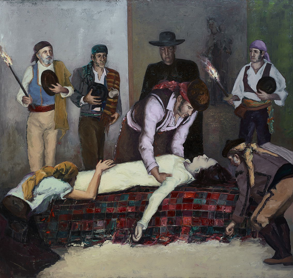 Varios bandoleros y una mujer forman un velatorio en la que el muerto parece yacer sobre una alpaca. Un gran crucifijo al fondo proporciona la esperanza de la transcendencia. Un bandolero español de época era un buen católico. En otro cuadro un grupo de cinco mujeres, con el consuelo espiritual de un sacerdote, lloran y se abrazan desconsoladamente ante el bandolero tendido en el suelo, muerto y con su mano derecha sujetando aún su trabuco. Cinco bandoleros y una joven parecen posar relajados junto a la entrada de su cubil. Tres mujeres arrodilladas llorosas y un hombre armado de pie con la cabeza inclinada parecen acompañar al muerto con barba que está tendido en el suelo. Un bandolero con su gente entra en su casa para retener, entre sus brazos. a su esposa muerta.