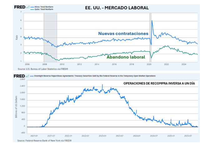 A este enfriamiento silencioso se suma un problema más técnico, pero igual de preocupante: la caída del nivel de liquidez en el sistema financiero. El indicador más claro es el “reverse repo facility”, un instrumento que la Fed usa para absorber exceso de efectivo de los mercados a corto plazo. Durante los últimos dos años, los saldos de esta facilidad han caído desde más de 2,5 billones$ a poco más de 300.000 millones. Ese descenso refleja que la liquidez sobrante se ha agotado. Si el QT continuara al mismo ritmo, podría empujar a los bancos y fondos monetarios a una situación de tensión similar a la que en 2019 obligó a la Fed a intervenir de urgencia en el mercado de repos. Por eso Powell ha abierto la puerta a frenar la reducción del balance. No porque la inflación esté controlada, sino porque la estabilidad del sistema financiero empieza a ser más urgente que el control de los precios. La historia reciente demuestra que cuando la liquidez se seca, los mercados se tensan, el crédito se encarece y la economía real sufre.