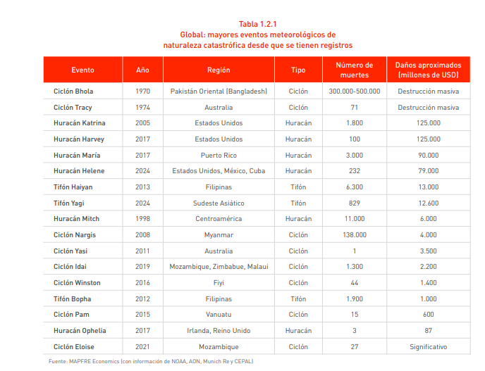 “Las pérdidas económicas por fenómenos meteorológicos y climáticos extremos están aumentando y se prevé que sigan haciéndolo debido a la mayor frecuencia y gravedad de las catástrofes causadas, entre otros factores, por el calentamiento global”, insiste. Según apunta la investigación de Mapfre, en 2024 este tipo de catástrofes provocaron pérdidas económicas que superaros los 300.000$ por novena vez consecutiva, un 14% más, de los cuales cerca de 145.000 millones estaban asegurados.