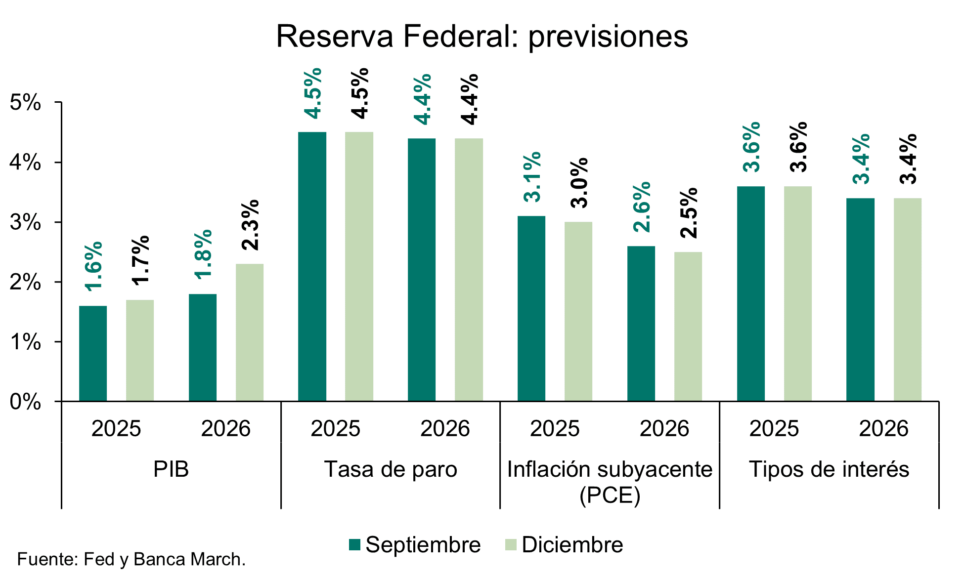 En cuanto a las previsiones económicas, el tono es notablemente optimista. El crecimiento estimado para 2025 se revisa al alza en una décima, hasta el +1,7%, y el del próximo año en cinco décimas, hasta el +2,3%. El Comité atribuye esta mejora a la resiliencia del consumo y a la ola de inversión impulsada por la tecnología. Para 2026, las proyecciones para la tasa de desempleo e inflación apenas varían respecto a septiembre: 4,4% y +2,4%, respectivamente.