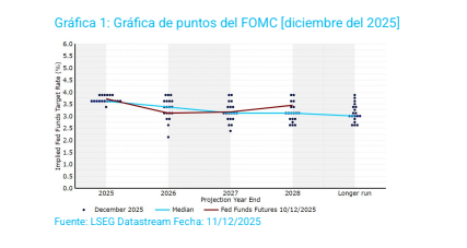 En una votación con 9 apoyos y 3 votos en contra, el Comité de la Reserva Federal decidió mantener la senda de reducción de los tipos oficiales, situándolos en la banda del 3,5%-3,75%.En la rueda de prensa Powell alternó mensajes más restrictivos –como la referencia a que los actuales niveles de tipos se aproximan a la neutralidad– con otros más moderados, como las alusiones a la debilidad del mercado laboral. Todo esto debido a la amplia división dentro del Comité, que en esta reunión se incrementó, con posturas dispares para 2026 que van desde tipos oficiales al 2,25% hasta otros que apuntan a mantener los tipos sin cambios. Según explicó, el Comité afronta riesgos en ambos frentes de su mandato: desaceleración del empleo e inflación elevada.