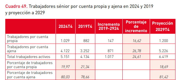 El V Mapa de Talento Senior. La evolución en el quinquenio2019-2024 y un ejercicio de prospectiva a 2029 subraya que la situación laboral de los mayores de 55 años "ha mejorado de una manera importante" en estos cinco años, donde ha aumentado en 1,14 millones, hasta los 9,6 millones. En todas las cohortes de edad hay ya más mujeres que hombres.