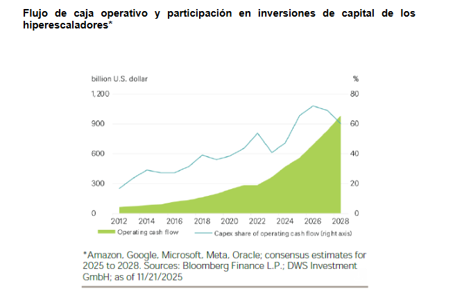 Pero la verdadera prueba de fuego para la sostenibilidad de estos modelos de negocio aún está por venir. Hiperescaladores como Microsoft, Alphabet, Meta y Amazon han revisado repetidamente al alza sus planes de inversión en capital y pueden permitírselo, gracias a su sólida generación histórica de flujo de caja. Su gasto en capital como porcentaje del flujo de caja operativo sigue estando en rangos manejables. Sin embargo, estas inversiones están transformando a los gigantes tecnológicos de innovadores con pocos activos a proveedores de infraestructura intensiva en capital, lo que plantea importantes preguntas sobre cómo los valorarán los mercados en el futuro.