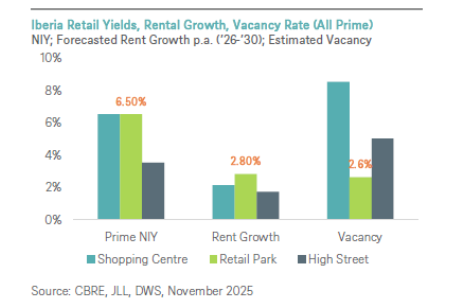 Dentro del sector minorista, algunas de las mejores oportunidades se encuentran en los parques comerciales. La inversión está aumentando, ya que los parques dominan los nuevos desarrollos en España y se expanden más allá de Madrid y Barcelona, hacia ciudades secundarias. Los proyectos son cada vez más compactos, orientados a entornos urbanos e integrados con zonas residenciales, a menudo contando con múltiples supermercados para ampliar la oferta a los consumidores. Está previsto que los alquileres aumenten, debido a la fuerte demanda de los minoristas y al limitado stock de calidad, mientras que los rendimientos comenzaron a comprimirse en 2025 y podrían seguir un patrón similar en 2026, lo que representa un posible “doble beneficio” que impulsaría los valores de capital. Impulsados por el crecimiento continuo del consumo privado y la adopción por parte de los minoristas de estrategias omnicanal, los parques comerciales podrían ofrecer ingresos relativamente resilientes y un potencial de crecimiento a largo plazo.