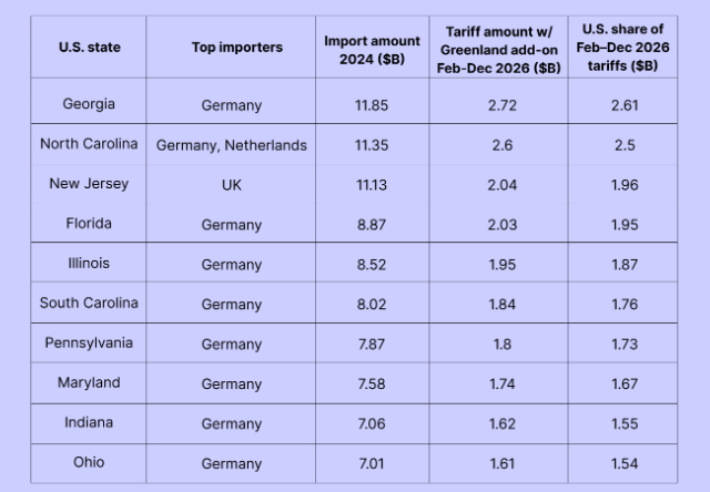 Georgia, Carolina del Norte y Nueva Jersey habrían absorbido 7.000 millones$ en costos arancelarios combinados. 31 estados de EEUU incluyen a Alemania entre sus cinco principales socios importadores, con Maryland y Rhode Island como su número 1. En todo EEUU, la carga arancelaria total de Groenlandia para los estadounidenses habría sido de 31.880 millones de dólares entre febrero y diciembre de 2026.