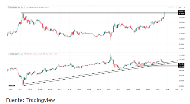 Desde el punto de vista técnico, la plata está intentando dejar atrás los máximos históricos de 2011 y 1979 en el entorno de los 50$ la onza. Al mismo tiempo, la ratio oro/plata, que ha mantenido una tendencia alcista (favorable al oro) desde 2011, comienza a romper esa directriz. "Es evidente que la plata se encuentra en un momento decisivo: o consolida la ruptura de estos niveles clave, abriendo la puerta a un movimiento hacia cotas mucho más ambiciosas, o bien rechaza esta zona de techos y entra en una fase correctiva significativa", subraya el analista Pablo Gil en The Trader.