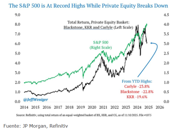 A esta señal se suma otra divergencia llamativa en los mercados. Mientras el S&P 500 continúa marcando máximos históricos, impulsado sobre todo por las grandes tecnológicas y por la narrativa de la inteligencia artificial, las grandes gestoras de private equity (Blackstone, KKR, Carlyle) han caído con fuerza desde sus máximos del año, entre un –20% y un –24%. Es un contraste poco habitual, porque ambas piezas del sistema financiero suelen moverse en la misma dirección.