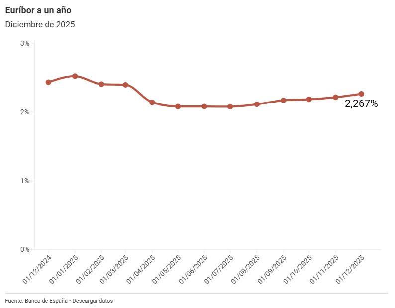 El índice Euribor a un año, que es utilizado como principal referencia para fijar el tipo de interés de los préstamos hipotecarios concedidos por las entidades de crédito españolas, se situó en diciembre en el 2,267% frente al 2,217% del mes anterior. Tomando como referencia los últimos 12 meses, el índice registra un descenso de 0,169 puntos, según los datos oficiales del Banco de España