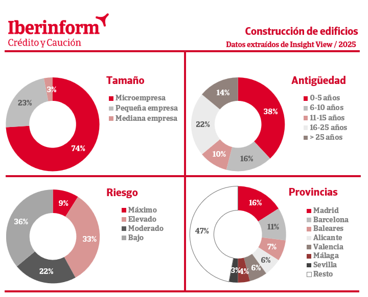 El sector muestra una fuerte atomización, con un 97% del tejido compuesto por micro y pequeñas empresas. Las grandes empresas apenas representan el 0,3% del total. De acuerdo con los datos que ofrece Insight View, las constructoras de edificios residenciales y no residenciales se concentran en las provincias de Madrid (16%), Barcelona (11%), Baleares (7%), Alicante (6%), Valencia (6%), Málaga (4%) y Sevilla (3%). De las primeras provincias del sector por tamaño, Baleares presenta el mayor deterioro del riesgo de crédito: el 61% de las constructoras de edificios del archipiélago (tres puntos más que hace un año) se encuentra en un nivel máximo o elevado de impago. Le siguen Málaga (56%) y Madrid (47%). Los menores ratios se registran en Murcia (36%), Alicante y Sevilla (38%) y Barcelona (40%).