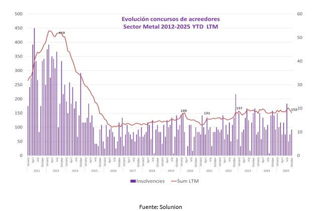 El ritmo anual de concursos en el sector se ha mantenido estable durante los últimos años, en torno a los 150-155 concursos al año. El sector metal mantiene una siniestralidad estructural por debajo de la media de sectores en España. El diferencial entre ambos se agrandó durante los años 2022 – 2024, debido al aumento de siniestralidad en otros sectores, mientras el sector metal se vio beneficiado por la extraordinaria rentabilidad en los años 2021 – 2022. El diferencial se ha ido estrechando, sin embargo, entre 2024 y 2025, debido a un peor comportamiento de metal con relación a la media del resto de sectores.