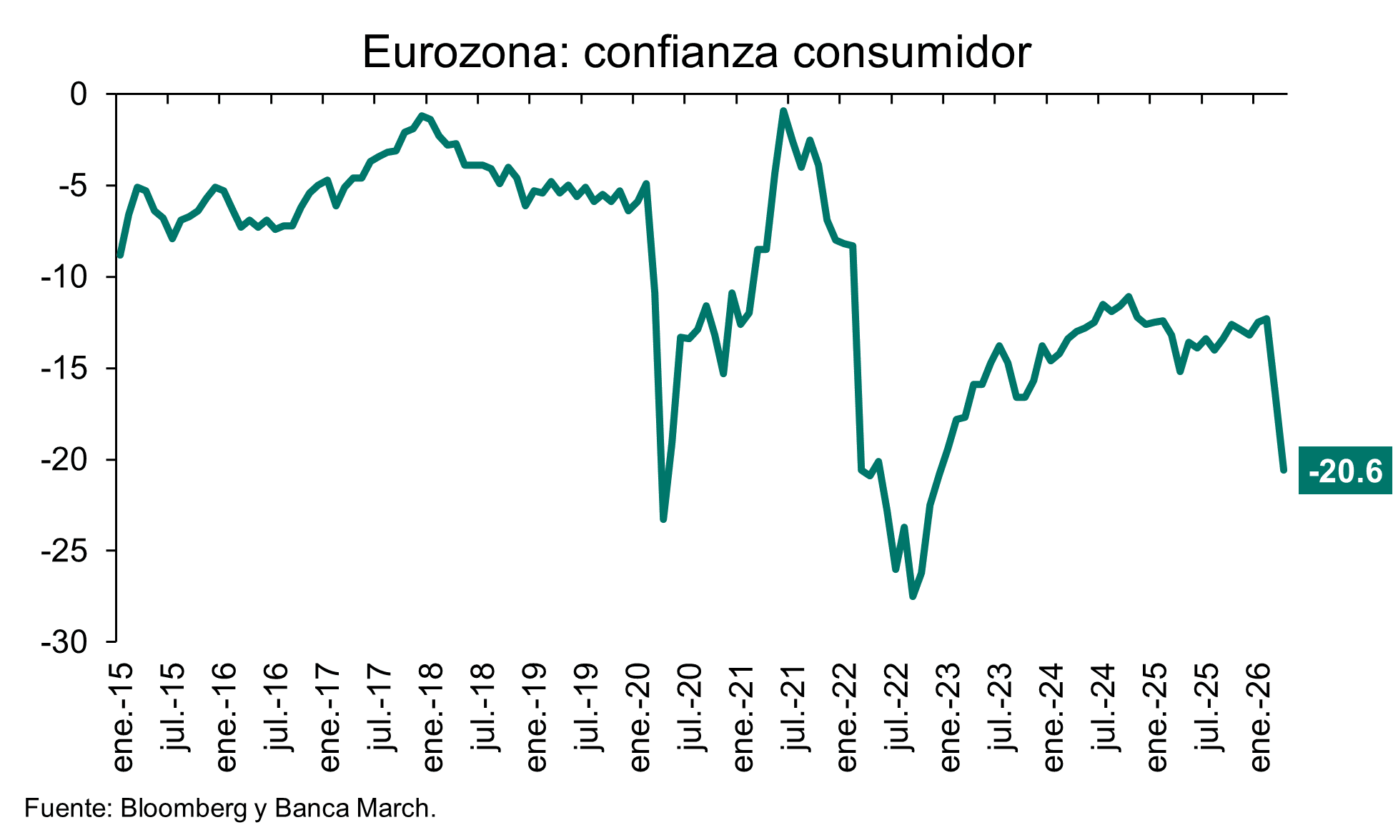 En la zona euro, la confianza de los consumidores sigue reflejando el efecto significativo del encarecimiento de la energía, alcanzando niveles no vistos desde diciembre de 2022. En abril, el indicador adelantado elaborado por Eurostat retrocedió hasta -20,6, por debajo del -17,2 estimado y del -16,4 correspondiente a marzo.