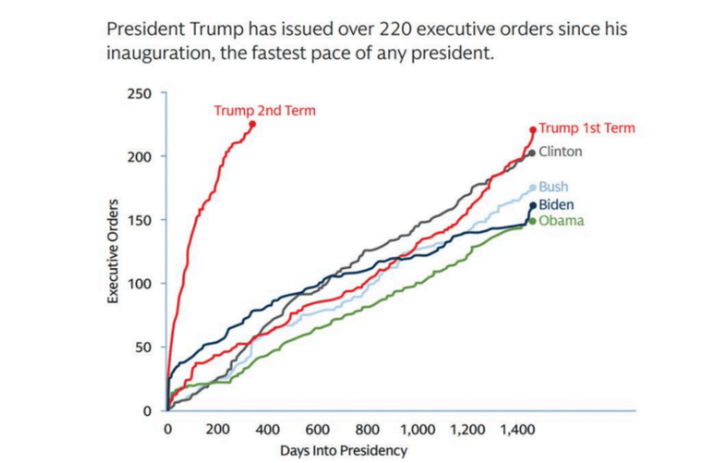 El gráfico que aporta el analista Pablo Gil en The Trader lo ilustra con claridad. No solo muestra la magnitud de las decisiones adoptadas en apenas doce meses, sino el método elegido para imponerlas. Trump ha recurrido de forma sistemática a órdenes ejecutivas para esquivar el debate parlamentario y evitar cualquier control efectivo por parte de la Cámara de Representantes, incluso contando con mayoría republicana. No es una cuestión de eficiencia legislativa. Es una forma de gobernar que busca situarse por encima de los contrapesos institucionales.