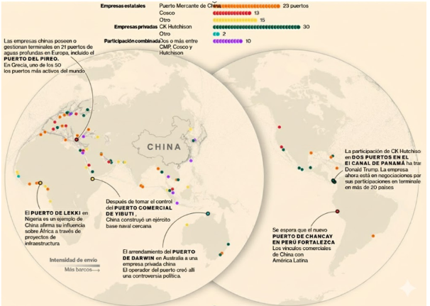 Pero la preocupación va mucho más allá de Panamá. China lleva dos décadas construyendo una red de influencia marítima que abarca más de noventa puertos de aguas profundas repartidos por todos los continentes. Empresas estatales como Cosco Shipping o conglomerados como Hutchison controlan o gestionan terminales en algunos de los enclaves más estratégicos del planeta: el Pireo en Grecia, Chancay en Perú, Lekki en Nigeria o Darwin en Australia. En total, las compañías chinas están presentes en un tercio de los puertos africanos y en un 10% de la capacidad portuaria europea. Esa red no solo garantiza ventajas comerciales, sino también geopolíticas. China exporta el 15% de los bienes mundiales y necesita mantener abiertas sus rutas marítimas, pero cada nueva concesión portuaria le da algo más que seguridad logística: le da influencia. En África, América Latina y el Mediterráneo, los puertos construidos con financiación china ya han recibido buques de guerra del Ejército Popular de Liberación. Y en el Cuerno de África, el que empezó como un “puerto comercial” en Yibuti, se transformó en la primera base militar china en el extranjero.