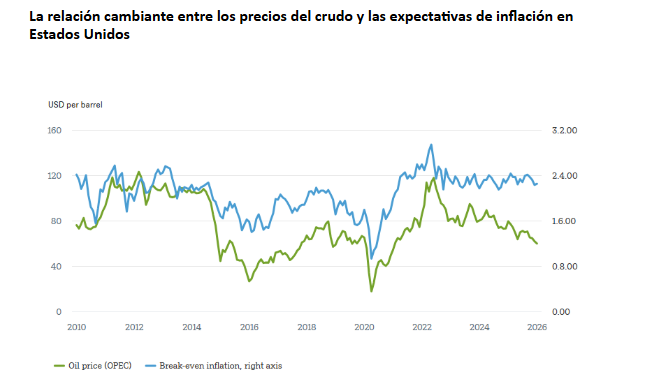 El gráfico aportado por DWS ilustra el mecanismo tradicional, que últimamente ha vuelto a acaparar la atención del mercado. Las tasas de inflación de equilibrio son la diferencia entre los rendimientos de los bonos indexados a la inflación y los nominales. Suelen considerarse un indicador de las expectativas de inflación en el mercado de bonos. Curiosamente, estas expectativas de inflación guardan una estrecha correlación con el precio del petróleo, como muestra el gráfico.