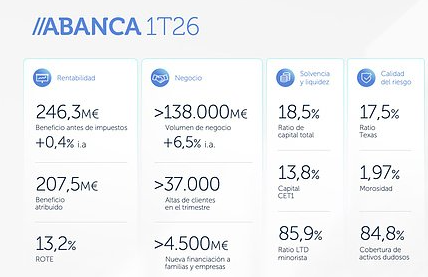 Abanca obtuvo en el primer trimestre de 2026 un beneficio atribuido de 207,5 millones€, con una rentabilidad del 13,2% y ganancias de cuota de mercado en todos los ámbitos del negocio. El crédito a familias y empresas aumentó un 4%; los recursos de clientes; un 5,2%. Los fondos de inversión aumentaron un 27,1% (el más del doble que el sector). Como resultado, la cuota de mercado en recursos fuera de balance aumentó en 21 pb.