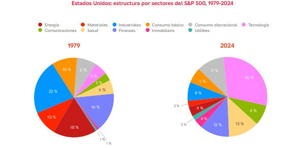 En EEUU la manufactura pasa de representar una cuarta parte del PIB en la década de los años setenta del siglo pasado, a cerca del 11% en la actualidad, principalmente por razones estructurales: fuerte crecimiento de la productividad industrial, traslado de valor añadido hacia servicios asociados (I+D, software, diseño), y un cambio de la demanda hacia salud, educación, ocio y servicios profesionales. Paralelamente, sectores como tecnología, información y comunicaciones, finanzas, servicios empresariales e inmobiliario se convierten en los motores del valor añadido.