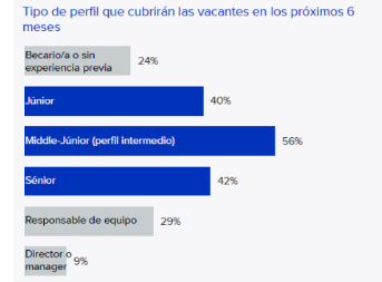 Entre las empresas que prevén contratar en los próximos seis meses, se aprecia que la capacidad de gestión y la experiencia previa de los perfiles intermedios son muy valoradas, ya que estos concentran la mayor intención de incorporación: el 56% afirma que cubrirá posiciones de este nivel. A continuación, destacan los perfiles sénior con un 42% y los júnior con un 40%.