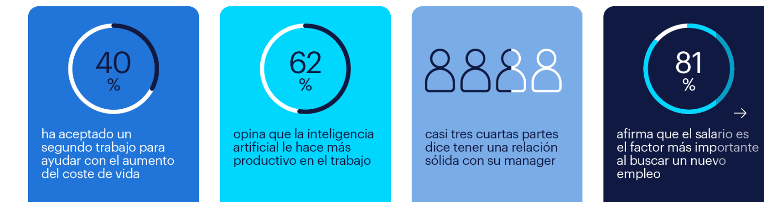 En este contexto de transformación tecnológica, también surge inquietud. A nivel global, un tercio del talento, concretamente un 34%, está preocupado por la posibilidad de que su empleo desaparezca en los próximos cinco años debido al impacto de la IA. Esta percepción coincide con que el 60% de los empleadores en España estima que la IA afectará a entre el 50% y el 100% de las tareas en sus organizaciones, anticipando una profunda transformación del trabajo.