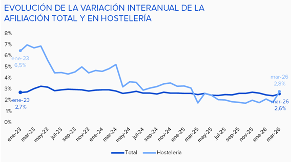 El registro de marzo refleja un aumento de 81.759 personas con respecto a febrero. La variación interanual es del 2,8 %. Actualmente hay 49.376 personas más trabajando en hostelería que en el mismo mes de 2025. No obstante, si se observa la tendencia que ha mantenido la variación interanual de la afiliación durante los últimos tres años se puede apreciar una moderación. Así, mientras que en 2023 todavía crecía a un ritmo significativamente superior al de la media nacional, progresivamente se ha ido suavizando y, desde hace prácticamente un año, su evolución es algo inferior a la del conjunto de la afiliación.