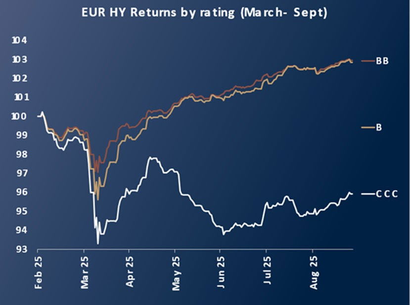 Por otra parte, el índice High Yield ha tenido un desempeño razonable en lo que va del año (+4,5%). Sin embargo, se ha producido una fuerte caída en los bonos CCC, el segmento donde las reestructuraciones empresariales están sucediendo, o están a punto de suceder.