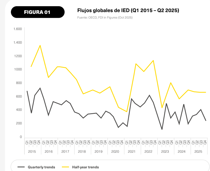 En el primer semestre de 2025 (últimos datos disponibles) los flujos mundiales de IED se situaron en 663.000 millones$, un 6% por debajo de los niveles registrados un año antes. La inversión internacional se decide hoy con más cautela, con más sensibilidad al riesgo y con una concentración mayor en sectores y proyectos que ofrecen escala, seguridad y retorno. El inversor tiende a concentrarse en menos proyectos, pero más grandes en capital, en lugar de repartir apuestas en muchos medianos.