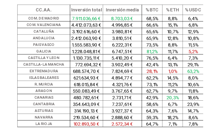 El bitcoin sigue siendo la principal opción de inversión para los españoles, representando más del 65% del total en la mayoría de las comunidades autónomas. Sin embargo, se observan diferencias según la comunidad. Según Criptan, las comunidades autónomas más volcadas en este criptoactivo son Galicia (81,2%), Castilla y León (76,5%), País Vasco (73,5%), la Región de Murcia (73,1%) y la Comunidad de Madrid (68,5%). En el extremo contrario, Extremadura (28,1%), Canarias (42,9%), Cantabria(58,6%), Navarra (59,3%) y Asturias (64,28%).