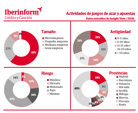 La distribución por tamaños empresariales muestra un 61% de microempresas y un 27% de pequeñas empresas, con un relevante 9% de medianas y un 3% que ha alcanzado el tamaño de gran empresa. La antigüedad es un factor muy significativo a la hora de determinar los riesgos de crédito del sector. El 31% de las empresas de apuestas y juegos de azar supera el cuarto de siglo. Entre ellas, solo el 16% presenta un riesgo elevado o máximo. Este ratio se eleva al 36% entre las empresas creadas en los últimos diez años, que representan el 34% del total.
