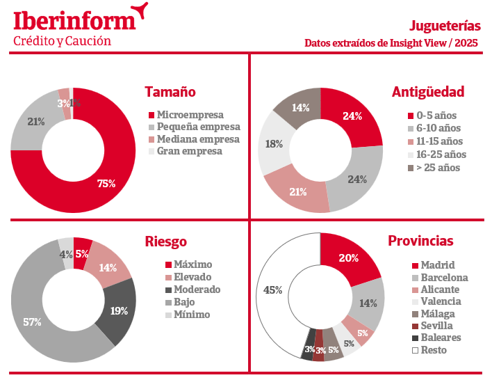 Los comercios presentan en cinco de estas siete provincias tasas de riesgo de impago por encima de la media, un indicativo de que la concentración sectorial tiene un efecto pernicioso para la salud financiera de las jugueterías: el 29% del sector en Madrid se encuentra en un nivel máximo o elevado de riesgo. Le siguen Sevilla (25%), Málaga (24%), Barcelona (22%) y Alicante (20%). El menor riesgo de crédito entre las principales provincias donde se concentra el sector se registra en Baleares, Murcia y Pontevedra (15%), Valencia (14%), La Coruña (13%) y Genora (4%).