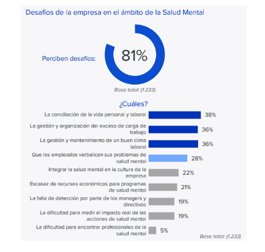 Este bajo nivel de prioridad convive con una elevada percepción del problema en el tejido empresarial, pues existe un amplio consenso en torno a la complejidad del fenómeno: el 81% de las compañías afirma percibir desafíos en el ámbito de la salud mental entre sus trabajadores. Entre los principales retos destacan la conciliación de la vida personal y laboral (38%), la gestión y organización del exceso de carga de trabajo (36%) y el mantenimiento de un buen clima laboral (36%). Esto configura un primer nivel de preocupaciones directamente vinculadas al día a día organizativo.