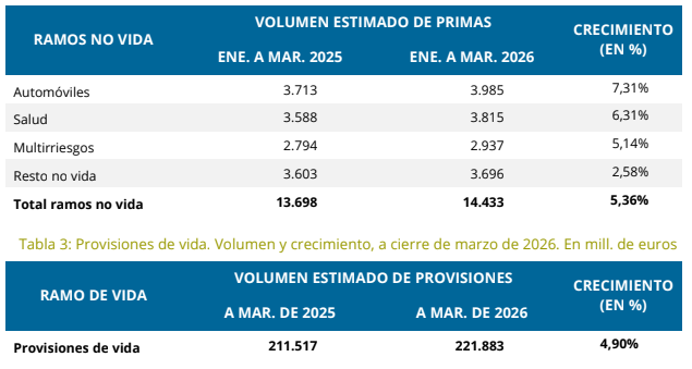 Los ingresos por primas de las aseguradoras se situaron en 24.449 millones€ a cierre del primer trimestre de 2026, un 6,99% más que en el mismo periodo del año anterior. De la facturación lograda a lo largo del ejercicio, 14.433 millones correspondieron a No Vida y los 10.016 millones restantes, al de Vida, según muestran los datos provisionales recabados por Investigación Cooperativa de Entidades Aseguradoras (ICEA).