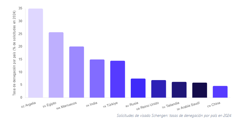 Entre los principales países expendedores, Francia muestra una tasa de denegación del 15,8% en 2024 — ligeramente por encima de la media Schengen (14,8%) — mientras que los países de alto volumen tienden a exhibir tasas más estables debido al tamaño de su base de solicitudes.