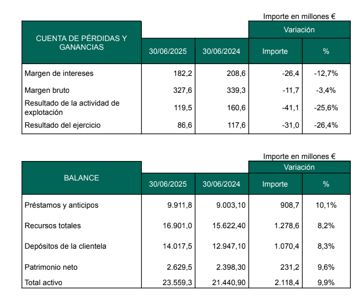 Su ratio de solvencia es el más alto de la banca española: a 30 de junio de 2025, se situó en el 25,45%, frente a una media sectorial del 13,77%. También mantiene una de las tasas de mora más bajas del sistema financiero español sin haber recurrido a la venta masiva de carteras a descuento: un 1,31%, frente a un 2,97% de media del sector. Los ratios de liquidez —LCR (224,86%) y DTL (181,32%)— y cobertura de riesgos dudosos (71,22%) figuran entre los más elevados del sector.