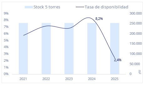En este contexto, el distrito de Cinco Torres destaca por presentar uno de los niveles de disponibilidad más bajos de Madrid, situándose por debajo del 2,5% y muy alejado de la media de la ciudad, con apenas 6.500 m² libres sobre un total de 230.000 m². La ocupación al 100% de Torre Emperador Castellana refleja el comportamiento cuantitativo del submercado y su alineación con las tendencias observadas en los activos prime de Madrid, donde la estabilidad del producto de mayor calidad continúa siendo un elemento diferencial.