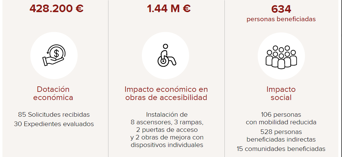 Según la Memoria de Actividades 2025, la entidad destinó más de 428.000€ a ayudas, tanto directas como indirectas. En el primer caso, la dotación, agotada en apenas tres meses, permitió poner en marcha obras valoradas en 1,1 millones en Barcelona, Badalona,Sant Boi del Llobregat, Madrid y Valencia. Además, la línea de financiación al 0% ha permitido que más de 40 personas con movilidad reducida en Viladecans, Oviedo y Avilés hayan podido ganar autonomía mediante la instalación de ascensores y rampas.