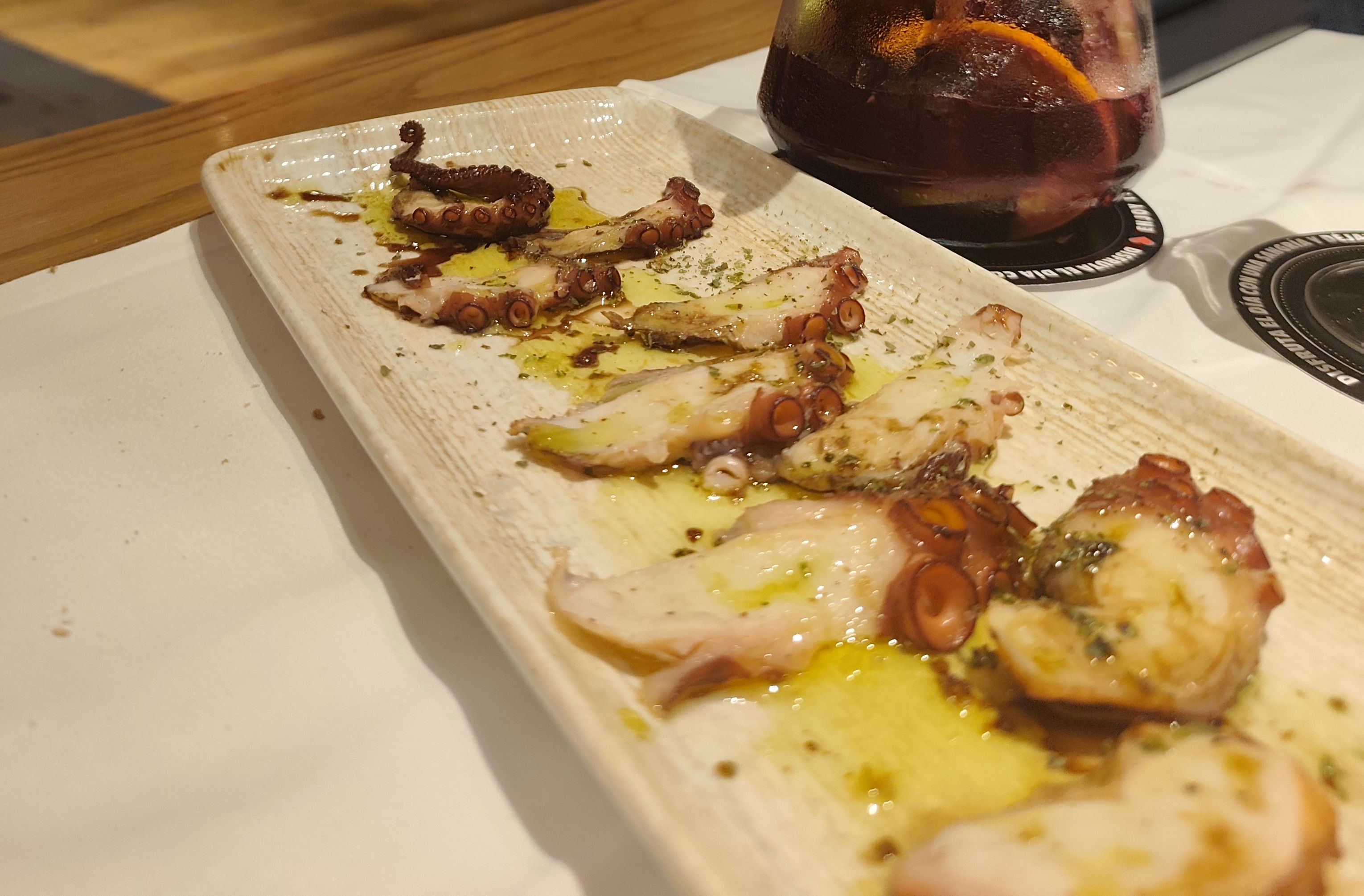 Fiel a su costumbre, el aperitivo de la casa para abrir boca, con un soberbio chorizo y unas picantes aceitunas. Seguimos la recomendación de la atenta camarera y optamos por una sangría Premium Cabecita Loca, con canela en rama de Sri Lanka y vainas de vainilla de Papúa Nueva Guinea, elaborada con ingredientes naturales. Espectacular, sobre todo cuando absorbe todo el sabor de la fruta natural de la jarra. Nada que ver con ese brebaje que pulula en los chiringuitos playeros.
